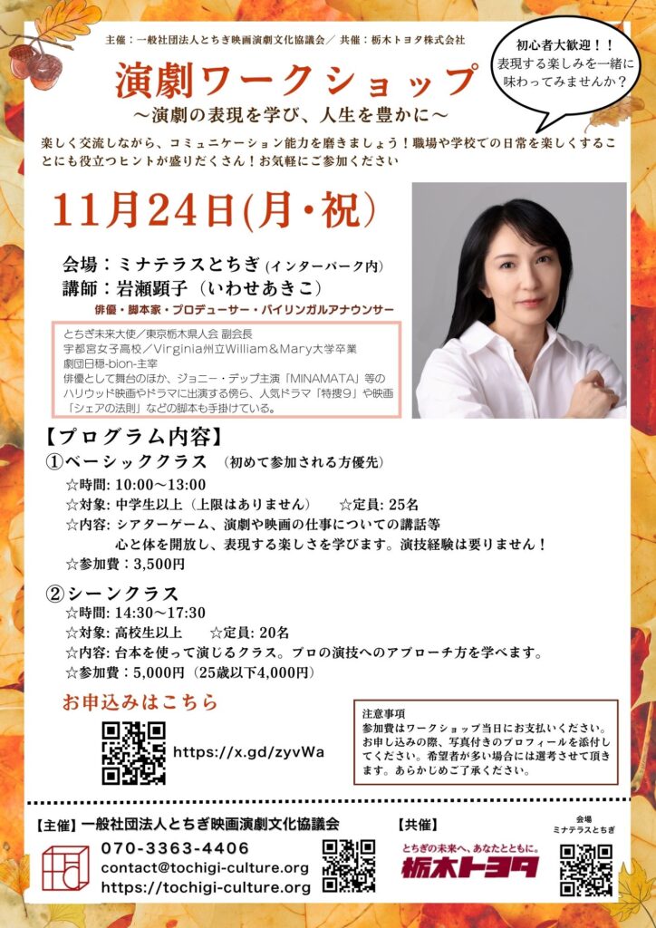 11月24日(月・祝)に、宇都宮のミナテラスとちぎで演劇ワークショップを行います。